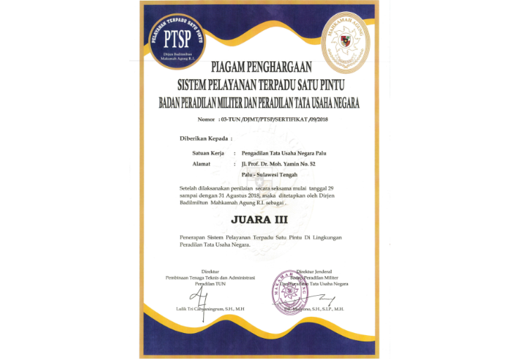 Pengadilan Tata Usaha Negara Palu mendapatkan Sertifikasi Akreditasi Penjamin Mutu Badan Peradilan Militer dan Peradilan Tata Usaha Negara dari Direktorat Jenderal Badan Peradilan Militer dan Peradilan Tata Usaha Negara dengan Akreditasi "A" (Excellent) pada Tahun 2018